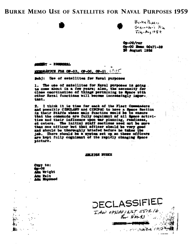 Noting that “The use of satellites for Naval purposes is going to come about in a few years; also the necessity for close coordination of things pertaining to Space with other Naval functions will became increasingly important,” Burke concluded that “I think it is time for each of the Fleet Commanders and possibly CINCLANT and CINCPAC to have a Space Section in their Staffs whose main function would be to ensure that the commands are fully cognizant of all Space activities and their influence upon war planning, readiness, et cetera….There should be a system set up so these officers are kept fully cognizant of the rapidly changing Space Picture.”