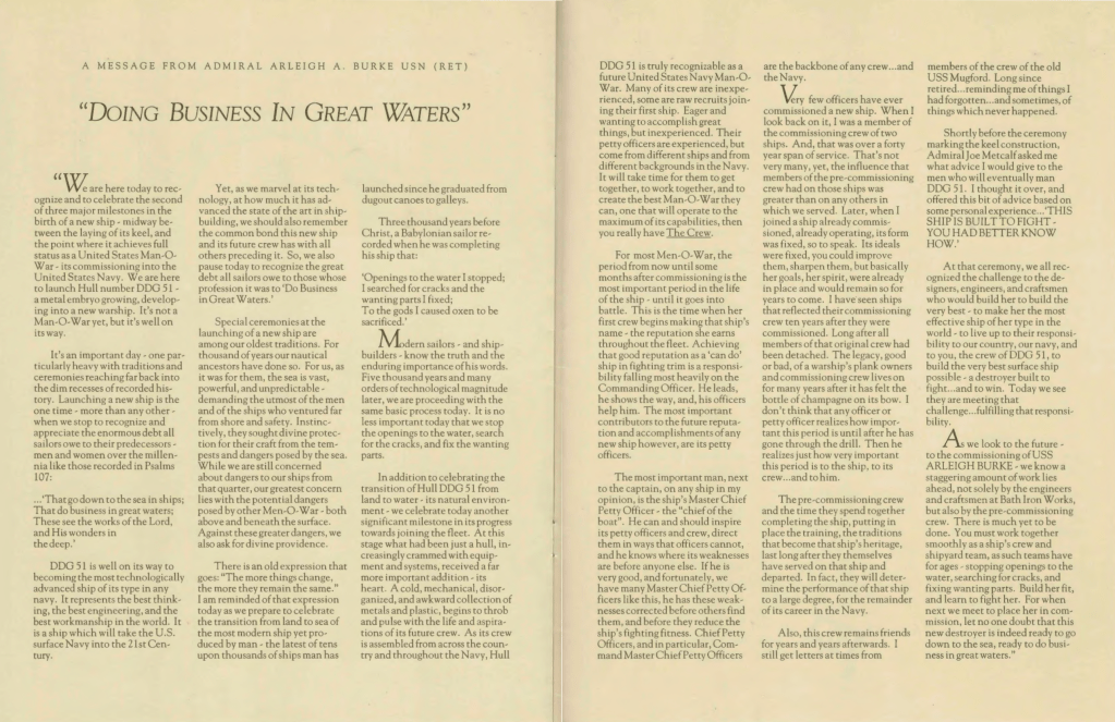 As we look to the future – to the commissioning of USS ARLEIGH BURKE – we know a staggering amount of work lies ahead, not solely by the engineers and craftsmen at Bath Iron Works, but also by the pre-commissioning crew. There is much yet to be done. You must work together smoothly as a ship’s crew and shipyard team, as such teams have for ages – stopping openings to the water, searching for cracks, and fixing wanting parts. Build her fit, and learn to fight her. For when next we meet to place her in commission, let no one doubt that this new destroyer is indeed ready to go down to the sea, ready to do business in great waters.”