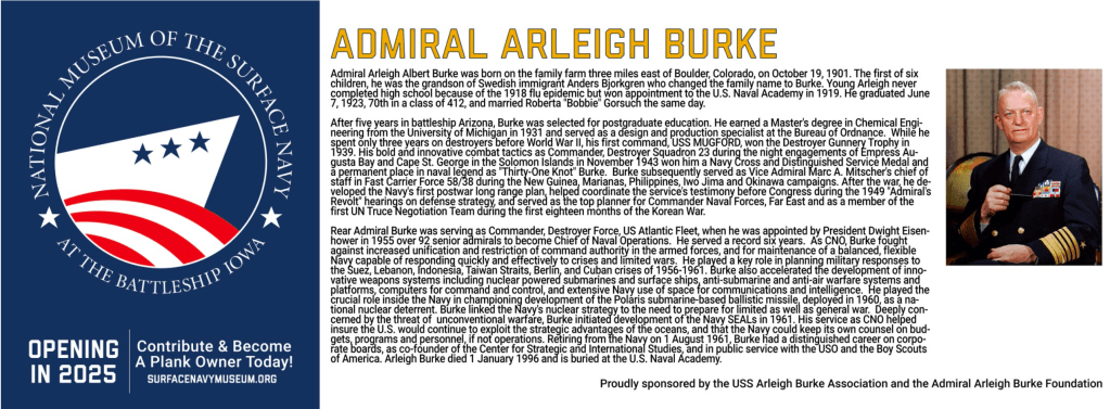 Initially, the Foundation’s efforts are focused on coordinating with the National Museum of the Surface Navy on development of “The Admiral Arleigh Burke Hall of Naval Heroes” to include a permanent exhibit on Admiral Arleigh Burke in the museum housed on ex-USS IOWA in Los Angeles. The museum is set to fully open in 2025, the 250th anniversary of the U.S. Navy.