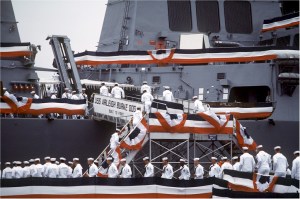 The USS Arleigh Burke (DDG-51), named for Admiral Arleigh A. Burke, USN (1901-1996), is the flag ship of the Arleigh Burke-class guided missile destroyers. Her keel was laid by Bath Iron Works at Bath, Maine, on 6 December 1988, and the ship was launched by Mrs. Arleigh Burke on 16 September 1989. Admiral Burke attended the ship’s commissioning on 4 July 1991, at Town Point Park in Norfolk, Virginia.